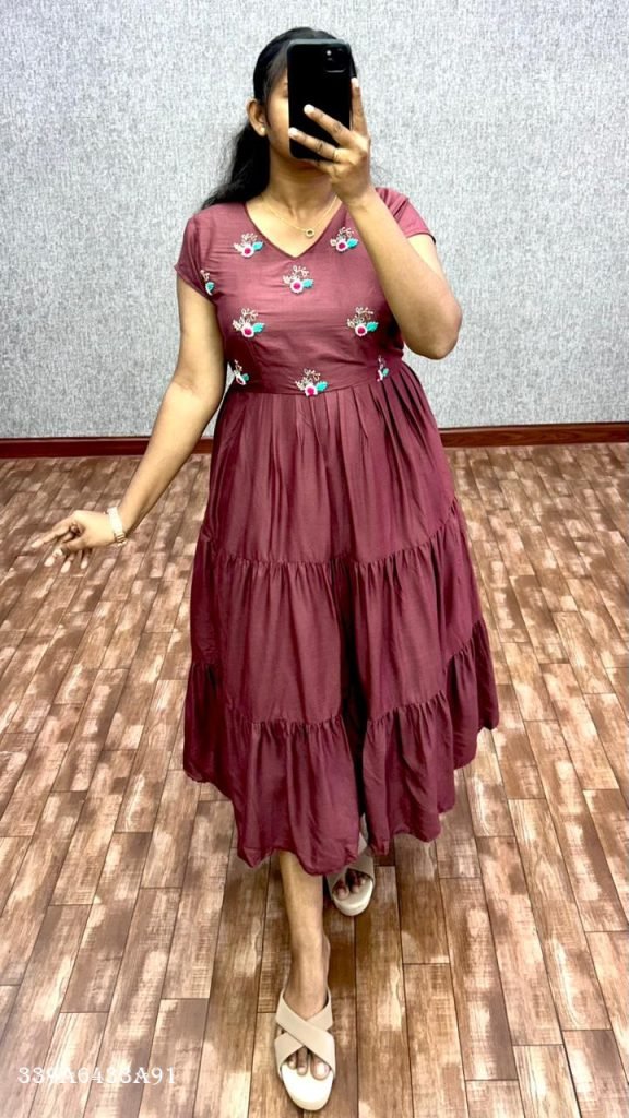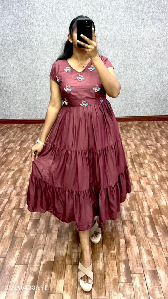 Premium cambric cotton designer gown with intricate maggam and handwork, offering a stylish and elegant look. Featuring a 4-meter flair and fully stitched design, perfect for festive and casual occasions.