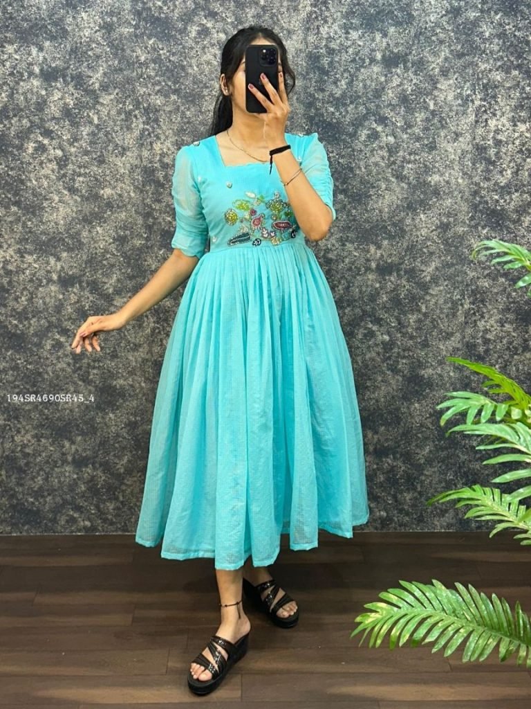 SKU : 194SR4690SR45_4FABRIC : Pure Soft Kota DoriyaINNER : Micro CottonCOLOR : BlueLENGTH : 48SLEEVES : Half SleevsNECKLINE : SquareWASH CARE : Hand Wash
