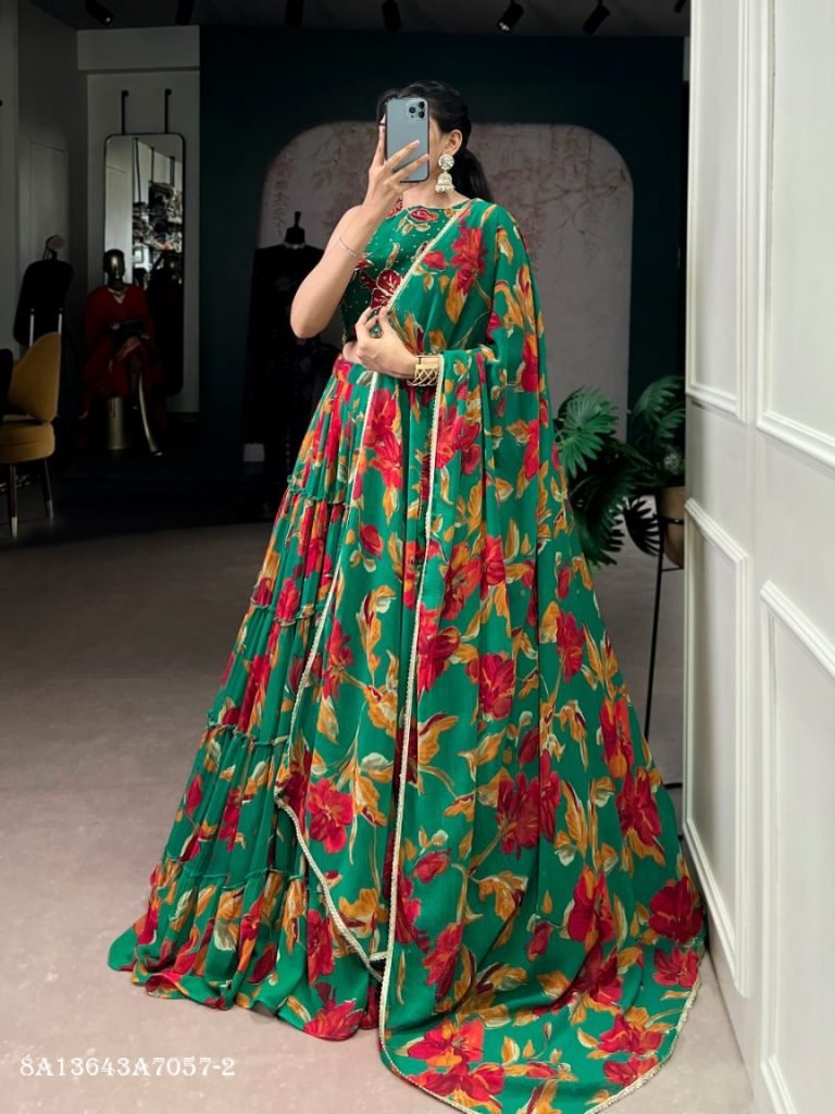 Elegant marble fabric lehenga featuring vibrant floral prints with heavy 12-meter flair for a grand festive look. Paired with handwork blouse and lace border dupatta for a complete ethnic ensemble.