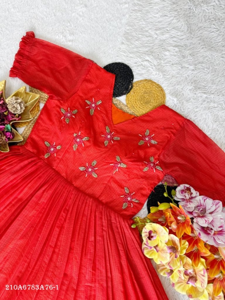 Grace meets craftsmanship in this beautifully designed gown featuring premium Kota Checks fabric with intricate maggam handwork. Designed with a flattering silhouette and rich detailing, this outfit offers a perfect blend of comfort and elegance for festive and occasion wear.