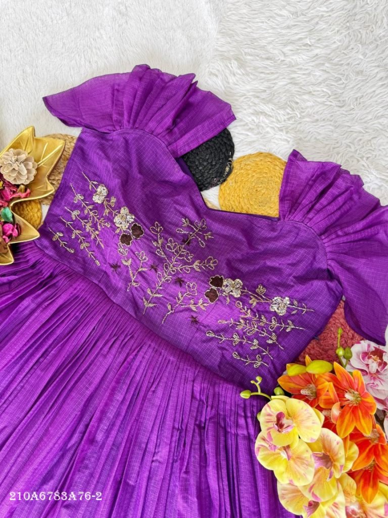 Grace meets craftsmanship in this beautifully designed gown featuring premium Kota Checks fabric with intricate maggam handwork. Designed with a flattering silhouette and rich detailing, this outfit offers a perfect blend of comfort and elegance for festive and occasion wear.