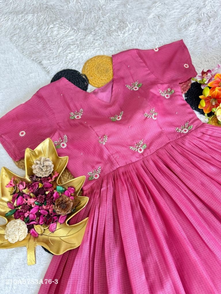 Grace meets craftsmanship in this beautifully designed gown featuring premium Kota Checks fabric with intricate maggam handwork. Designed with a flattering silhouette and rich detailing, this outfit offers a perfect blend of comfort and elegance for festive and occasion wear.