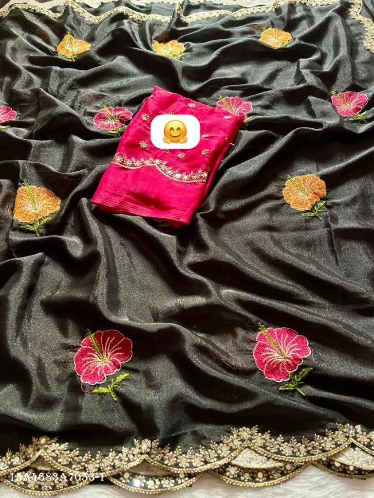 Elegant soft Rangoli silk saree featuring exquisite all-over embroidery with beautiful floral design, enhanced with real mirror work and a designer cutwork border.