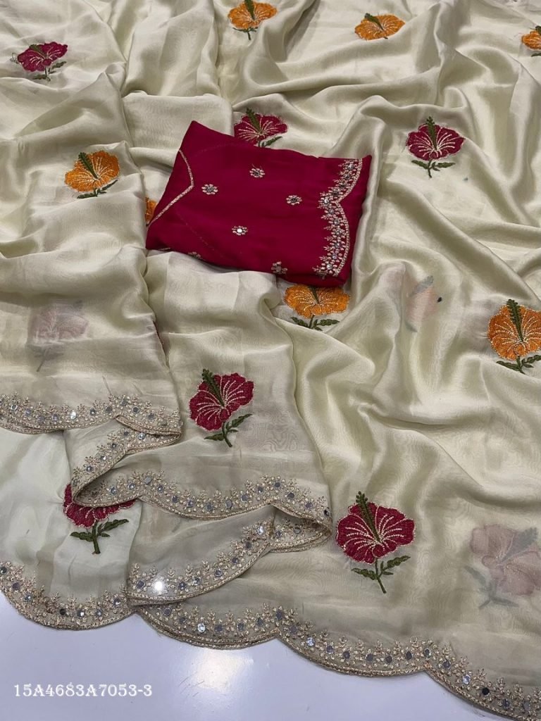 Elegant soft Rangoli silk saree featuring exquisite all-over embroidery with beautiful floral design, enhanced with real mirror work and a designer cutwork border.