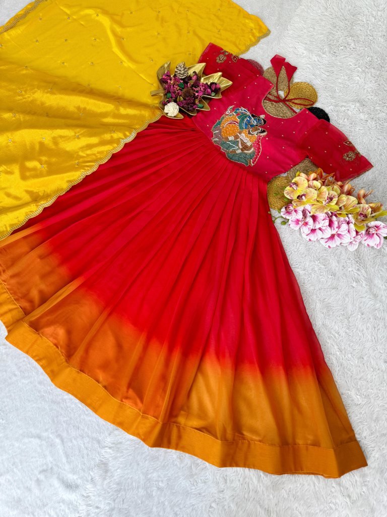 The Nitya Maggam Gown redefines festive grace by blending traditional Kalamkari divine art with the intricate precision of hand-crafted Maggam work. Tailored from luxurious Soft Faux Georgette, this ensemble features a dramatic 3.25-meter flair enhanced by a sophisticated gradient ombré finish. Fully stitched with a soft micro-cotton lining, it offers a high-glamour silhouette that moves effortlessly from traditional rituals to grand evening celebrations.