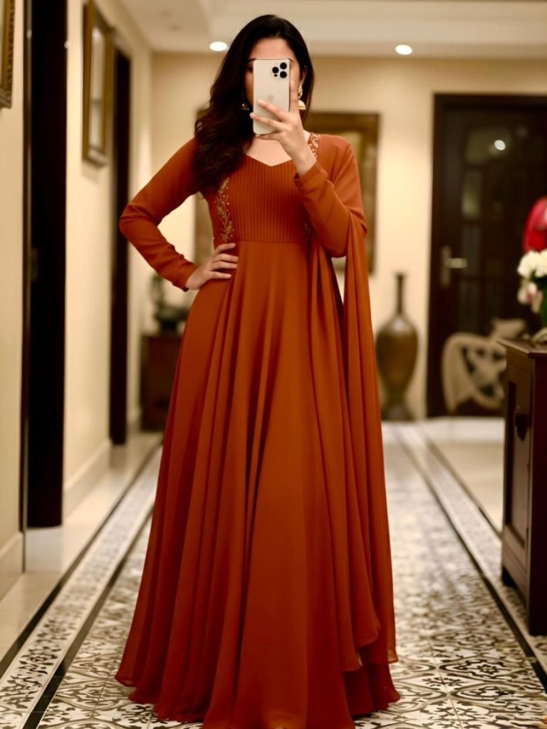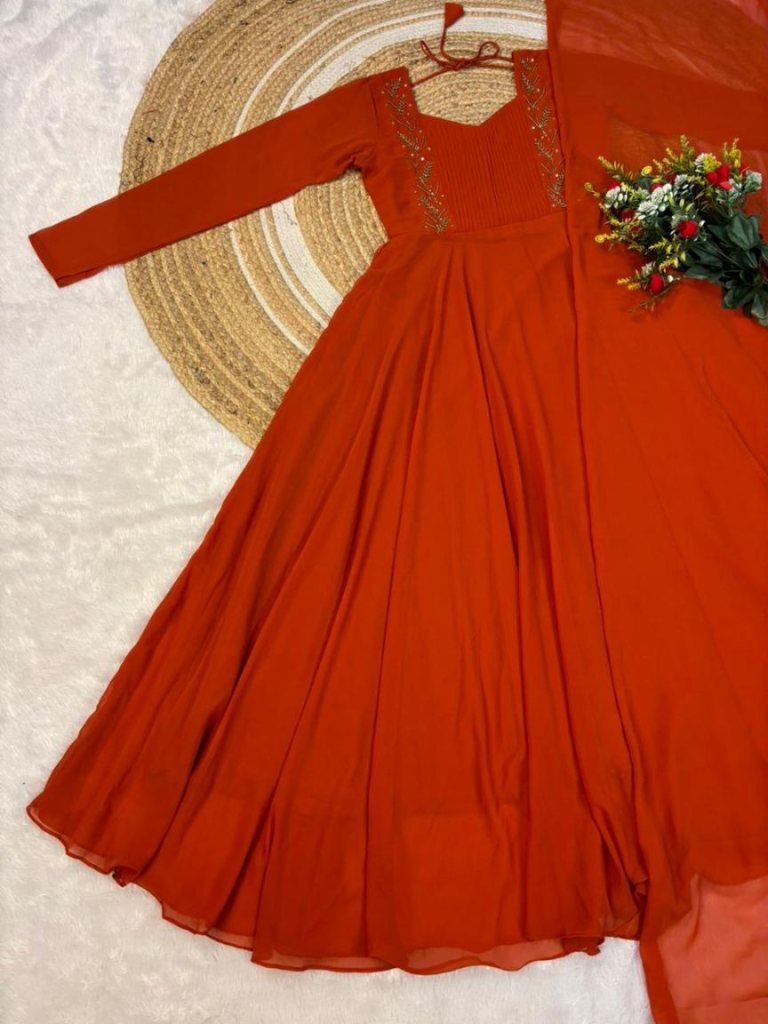 Elegant orange faux georgette gown featuring a beautifully designed pintucks yoke with delicate handwork. The graceful silhouette and soft flowing fabric create a stylish and sophisticated look, making it a perfect choice for festivals, parties, and special occasions.