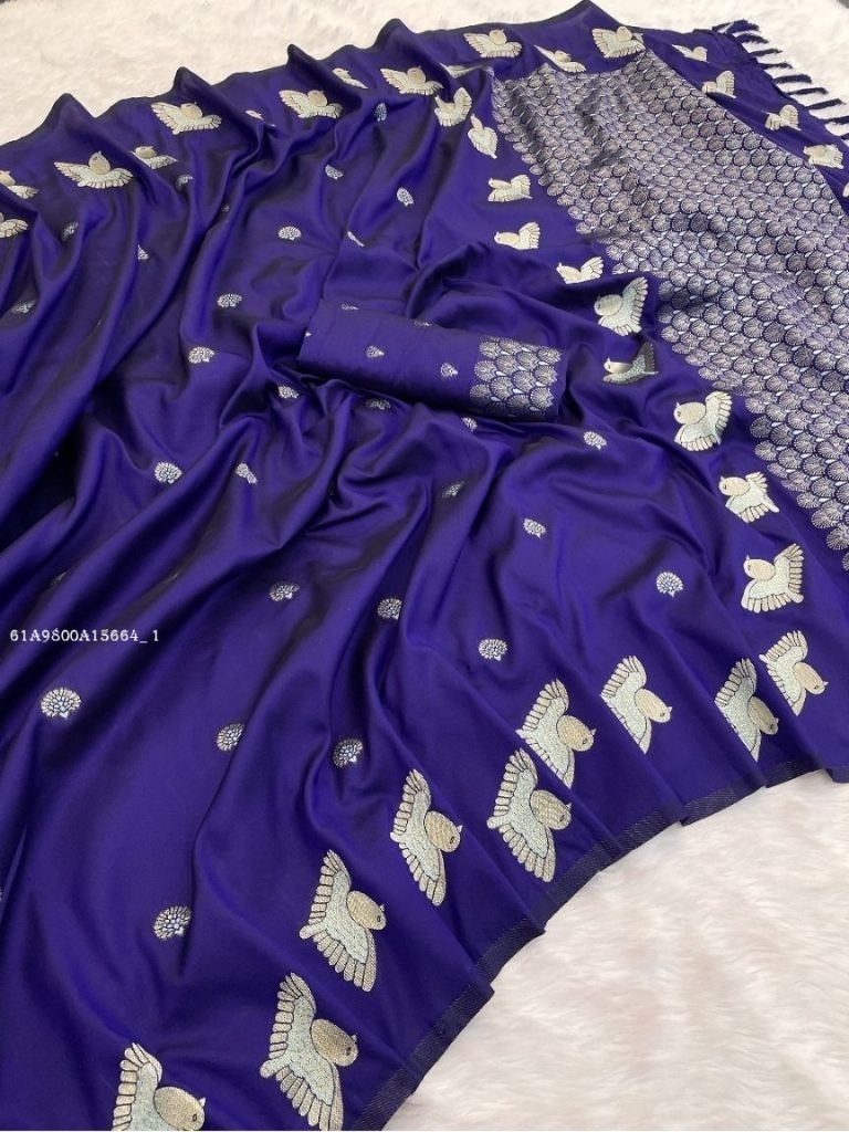Soft Moonga Silk sarees with zari floral motifs all over the body having Rich woven dual zari pallu and unique beautiful dual zari Bird border paired with broacde running blouse