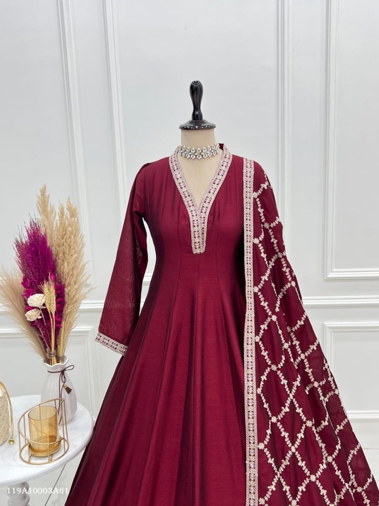 A graceful and luxurious full kali Anarkali gown crafted from heavy pure blooming Vichitra silk, designed to offer a rich traditional look with modern elegance. This fully stitched ensemble features intricate detailing and a grand flare, making it perfect for festive and special occasions.