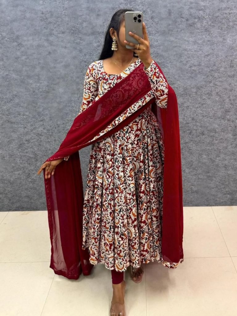 Elegant Red Kalamkari Printed Cotton Anarkali Gown designed for a graceful ethnic look. Made from breathable cotton fabric with traditional Kalamkari prints, this gown features a beautiful 4-meter flair that gives a rich Anarkali silhouette. It is paired with a soft georgette dupatta finished with a delicate 4-side lace border, making it perfect for festive occasions, family gatherings, and traditional events.