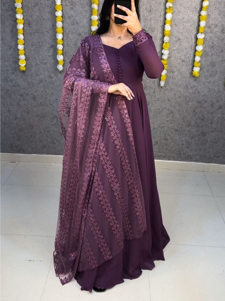 Crafted from soft faux georgette, this elegant party wear gown features a graceful flare and stylish front show button detailing. It comes with a beautiful net dupatta with floral embroidery and sequin work, adding a festive touch. The crepe lining and 20–21 inch sleeves ensure comfort and a classy look for weddings and special occasions