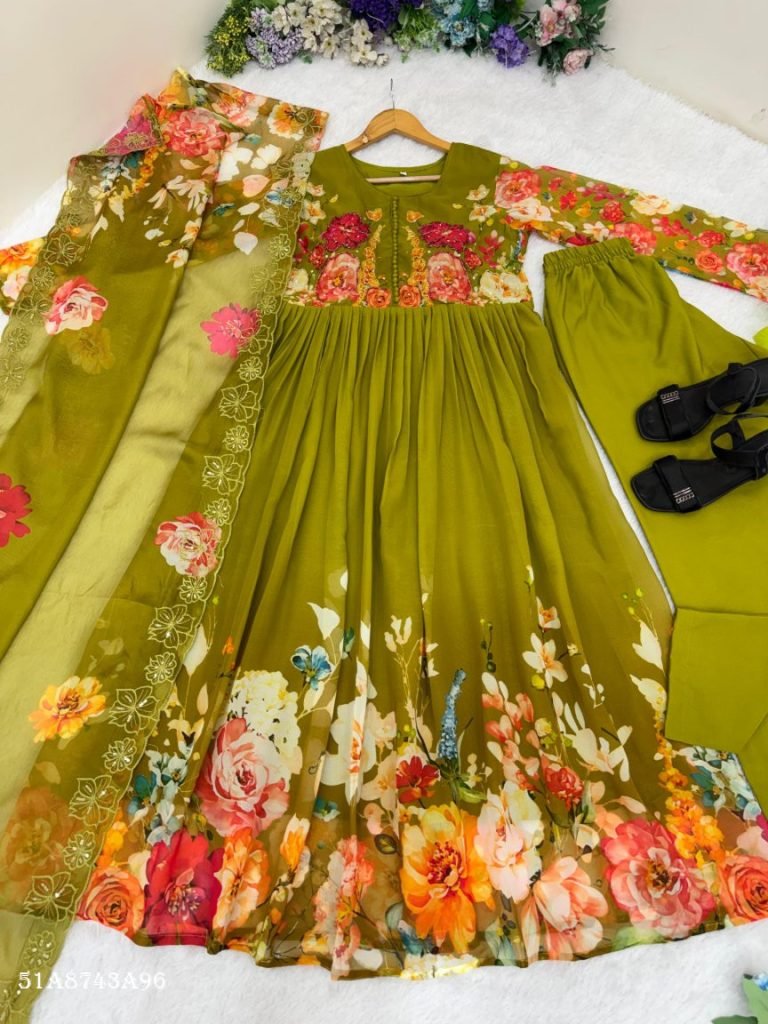 A beautifully crafted designer gown set featuring premium fox georgette fabric enhanced with intricate handwork on the neckline and sleeves. Paired with a soft inner for comfort, stylish crepe pants, and a digitally printed silk dupatta with embroidered sequence border, this outfit is perfect for modern ethnic styling with elegance and grace.