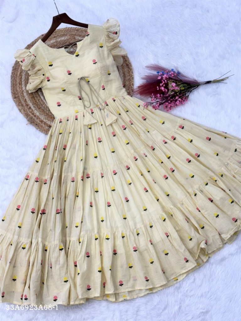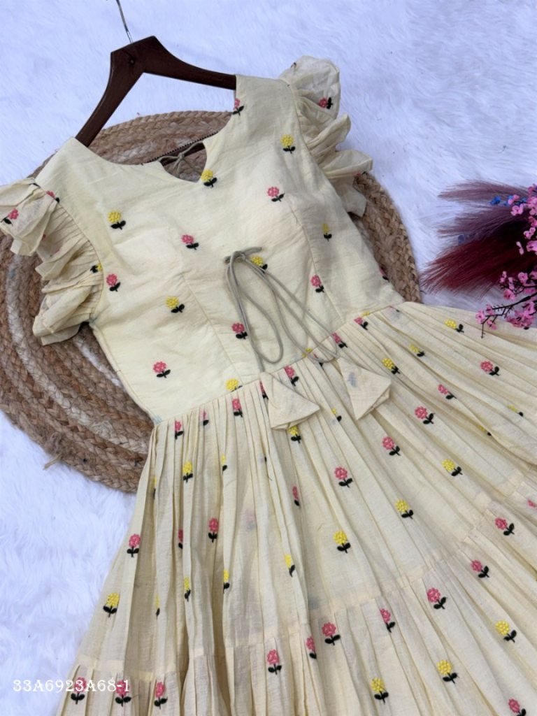 This beautifully crafted cotton dress features delicate embroidered motifs with a graceful 6-meter flair, offering a perfect blend of comfort and elegance. Designed with stylish shoulder frill sleeves and a flattering silhouette, it’s ideal for both casual outings and festive occasions.