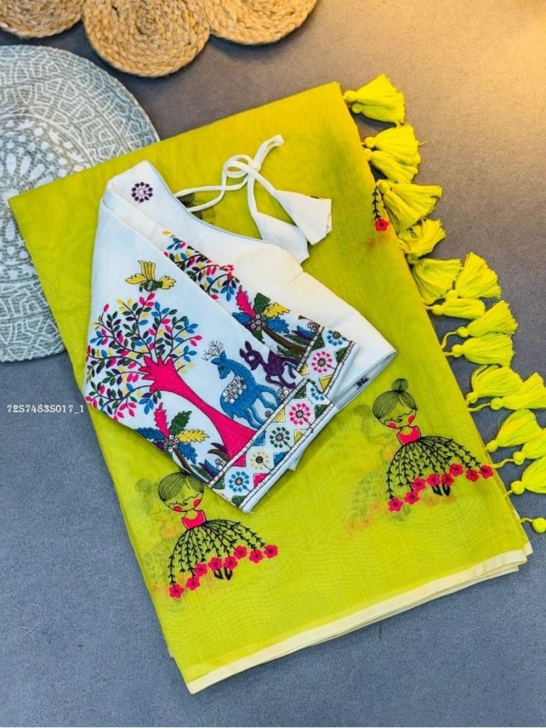Add elegance to your ethnic wardrobe with this embroidered cotton saree paired with a beautifully designed contrast blouse. The saree features delicate embroidery and tassel edging, offering a graceful drape that blends tradition with contemporary charm. The blouse piece is adorned with intricate ethnic motifs and vibrant embroidery, making it a statement look for festive occasions, cultural gatherings, and special celebrations. Crafted in breathable cotton, this saree ensures both comfort and timeless style.