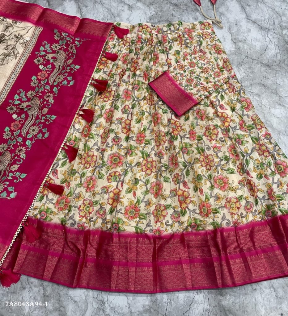 This beautifully crafted lehenga set showcases timeless Kalamkari artistry combined with rich zari weaving, offering a perfect blend of tradition and elegance. Designed in premium cotton silk jacquard fabric, this outfit ensures comfort while maintaining a festive appeal.