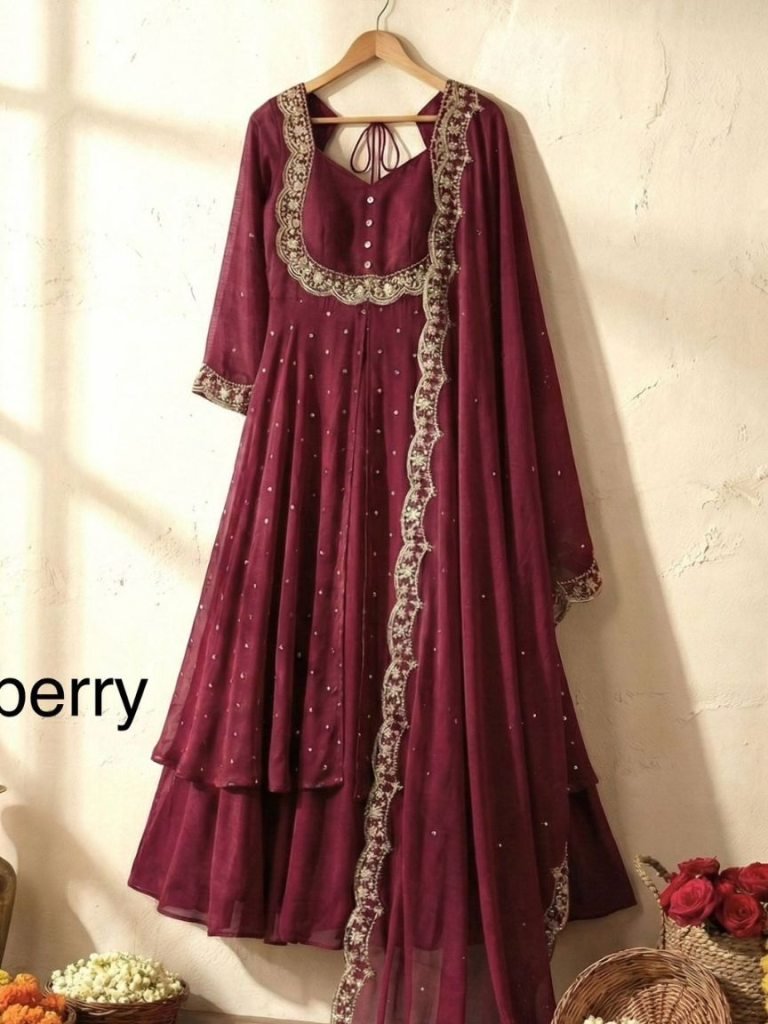 Elegant maroon Anarkali style gown crafted from premium Vichitra Silk with complete lining for comfort. Designed with a stylish round neckline and back tie-up, highlighted with beautiful gold threadwork and sequin embroidery on the neckline and dupatta border. Paired with a matching embroidered dupatta, this graceful outfit is perfect for festive occasions, weddings, and party wear.
